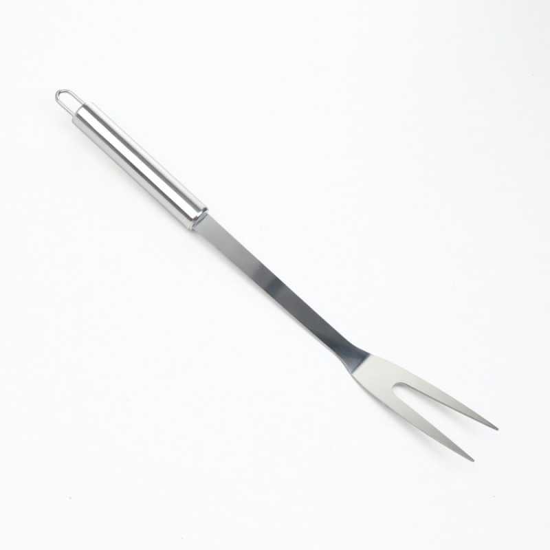 Furculița, cu aceeași lungime de 35 cm, este ideală pentru a înțepa și a manipula bucățile de carne și legume în timpul gătitului la grătar. Vârfurile sale ascuțite și rezistente permit perforarea ușoară a alimentelor, în timp ce mânerul său confortabil oferă o prindere sigură și stabilitate.