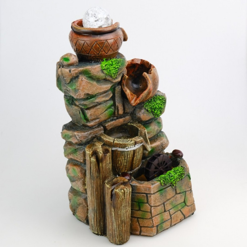 Fântâna decorativă este un element fermecător pentru a aduce un strop de natură și liniște în interiorul sau exteriorul casei tale. Cu dimensiunile sale de 37 x 21 x 18 cm, această fântână este potrivită pentru a fi amplasată pe mese, pe rafturi sau chiar în grădina ta.